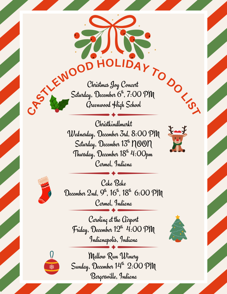 Castlewood Singers is always looking for new members. All candidates must be 18 years or older and be available for rehearsals every Tuesday evening. We perform three to four major concerts a year in central Indiana. Every five years, we travel outside of Indiana or even the United States. For more information and to register for auditions, e-mail Craig at auditions@castlewoodsingers.org